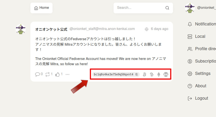 アーティストとそのファンをMitraの機能を体験させるため、オニオンケットはテストサーバーを作っていました。好きなアーティストをフォローまたは仮想通貨で購読するためファンが自由に「リードオンリー」アカウントを作れます。投稿権のあるアカウントはアーティスト専用のためで、申込が必要となります。検閲を振り落として作品を共有して、ファンから仮想通貨の支援を受けたいアーティストなら、アカウントを作ってもらうのにぜひご連絡下さい。もちろん、オニオンケットに参加するサークルさんたちは自動的にMitraアカウントが受けられます。それとも、可能であれば自分のMitraサーバーも作れることができます。その場合ではお互いに連合するためにアドレスをぜひ教えて下さい。